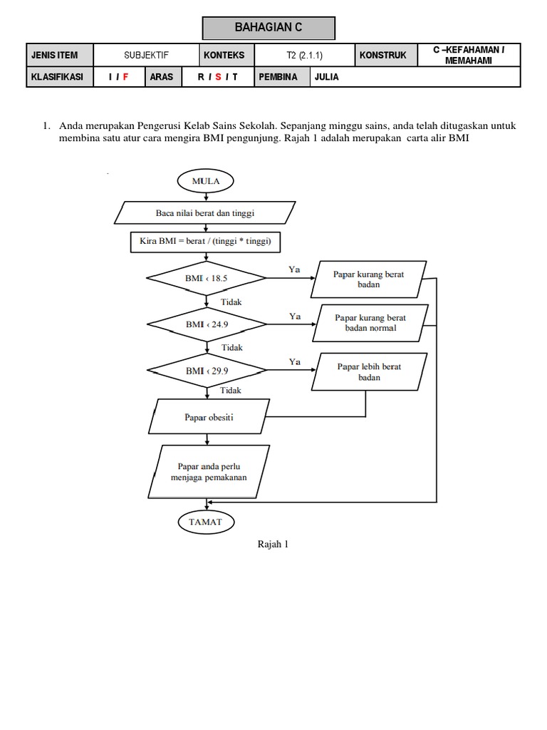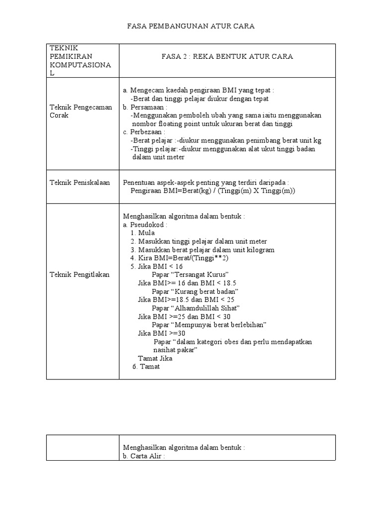 Membina atur cara mudah bagi mengira BMI bagi. Program Latihan Untuk Guru 2015 3 20 Menggunakan Algoritma melalui Pseudokod dan Carta Alir Carta Alir ialah kaedah grafik yang menunjukkan langkah-langkah bagi penyelesaian masalah dan hubung kait antara satu sama lain. Contoh Pengiraan BMI.